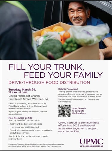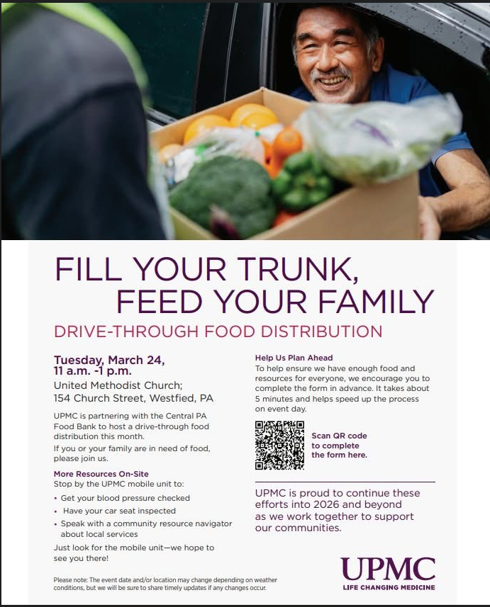 UPMC and the Central PA Food Bank are hosting a drive‑through food distribution at the United Methodist Church in Westfield on Tuesday, March 24, 11am-1pm. The event will also offer blood pressure checks, car seat inspections, and the chance to speak with a community resource navigator about local services. Scan the QR code to register and take advantage of this great community event!