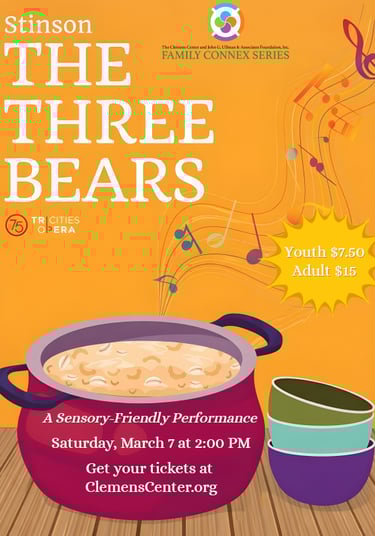On Saturday, March 7, 2026 at 2:00 p.m., the Clemens Center will present Tri-Cities Opera’s The Three Bears, a sensory‑friendly opera designed for children and adults on the autism spectrum, those with sensory sensitivities, and families new to live performance.