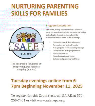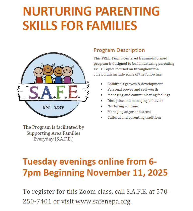 Great news! SAFE’s next Parenting Class begins Tuesday, Nov. 11, featuring the evidence-based Nurturing Parenting® Curriculum. Offered in partnership with Bradford/Sullivan Drug & Alcohol, SCA, the class is free and held virtually to support family access.